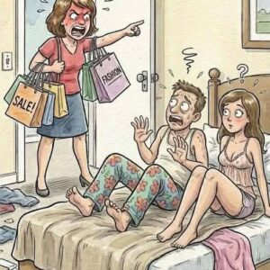 A wife arrived home after a long shopping trip, and was horrified to find her husband in bed with a young, lovely thing. Just as she was…